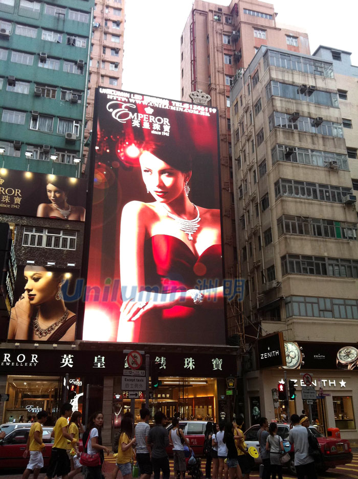 香港羅素街,是香港地標性建筑時代廣場的一條主要街道,作為香港最繁華的街道這里一直都是LED顯示屏企業(yè)必爭之地;香港英皇集團作為香港知名的珠寶鐘表商,有意借助LED顯示屏的展現(xiàn)方式在羅素街這塊“寶地”上為其公司宣傳造勢,LED屏幕的顯示效果和維護拆修是否便捷直接影響著項目的成敗;洲明人靈活應對,因地制宜根據(jù)樓體結構豎立的一個屏型采用P10戶外全彩顯示屏 5050CREE燈,燈驅(qū)合一,2掃,亮度7000,總面積163.43平米,將英皇珠寶奢華低調(diào)的美表現(xiàn)得淋漓盡致;