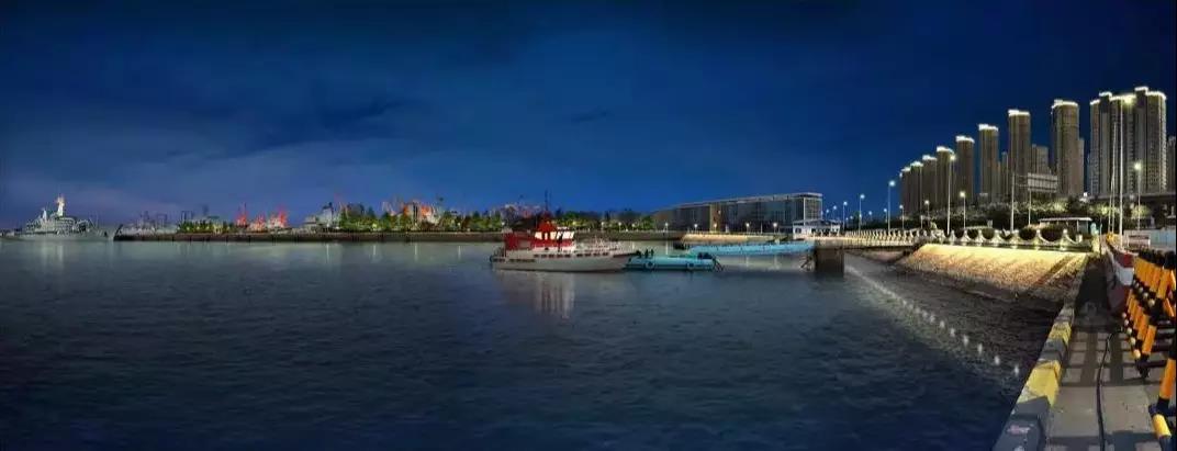 本項目為慶祝海軍成立70周年而籌建,按照性質劃分,總共包含構筑物、綠化道路、裝置雕塑、岸壁四個方面。其中構筑物包含了郵輪母港、糧囤、門機、奮進樓、普吉路入口等多個地點的景觀照明,裝置雕塑部分做了鐘塔和眾志成城雕塑,其次主要是3、4號碼頭岸壁的亮化和道路綠化簡單的點綴。