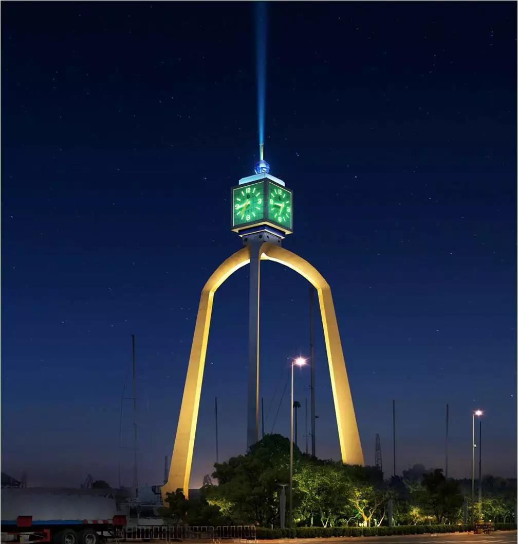 跨越鐘塔頂部采用4盞激光燈,作為整個項目唯一一處活動光景觀,增添亮彩。在柱腿下部新增設12盞150W投光燈渲染整體輪廓,達到設計效果。