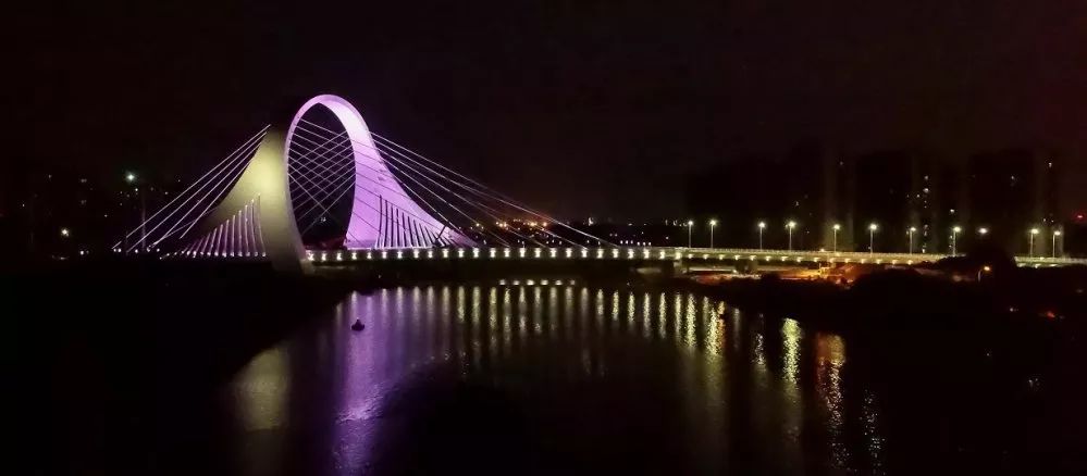 如墨夜色下,呈現明暗、多彩變幻的淮安運河大橋,如同水面上一顆璀璨閃耀的夜明珠,美輪美奐。