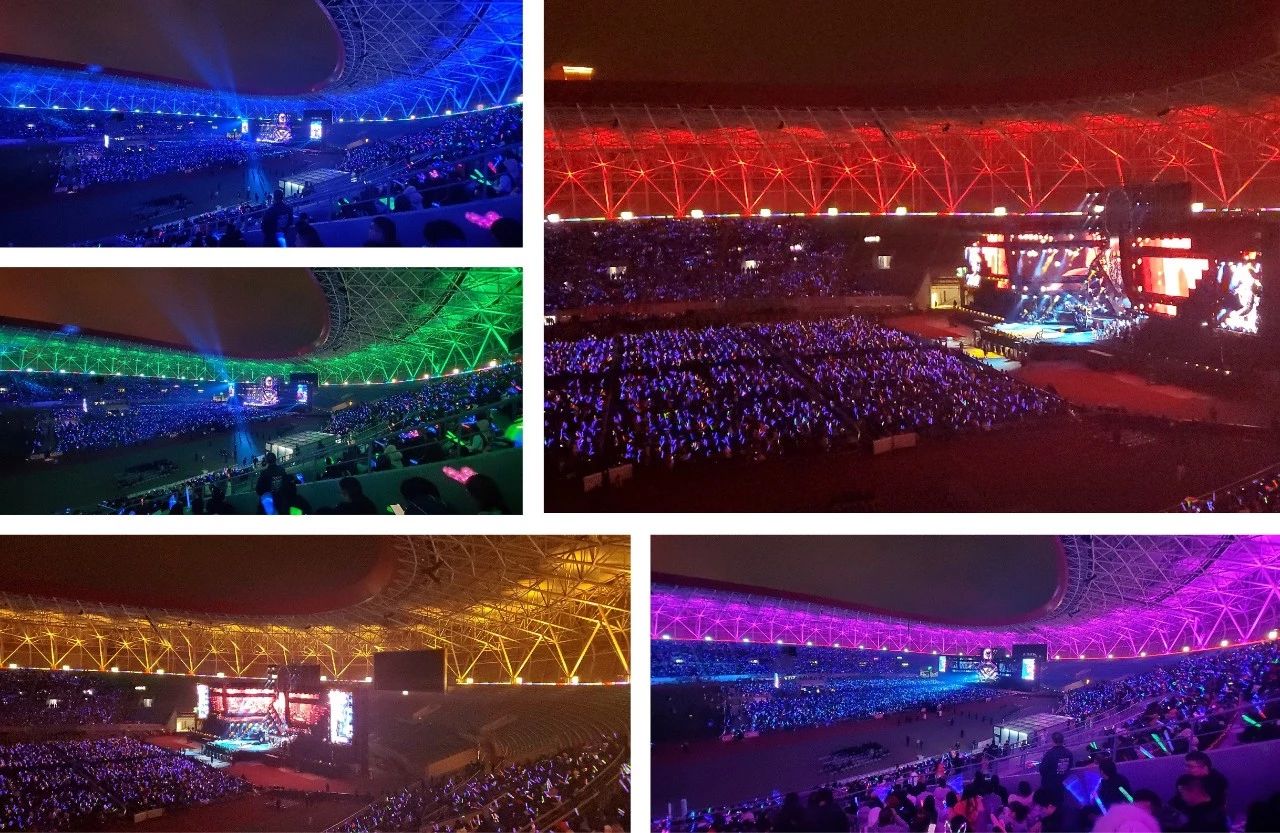 內場燈光色調選擇與標識配色協調統一,五種色彩交替變化,體現了現代感、科技感和時尚感。內場燈光與演唱會舞臺燈光相呼應,即烘托了現場熱烈的氣氛又不會過于絢麗而喧賓奪主。