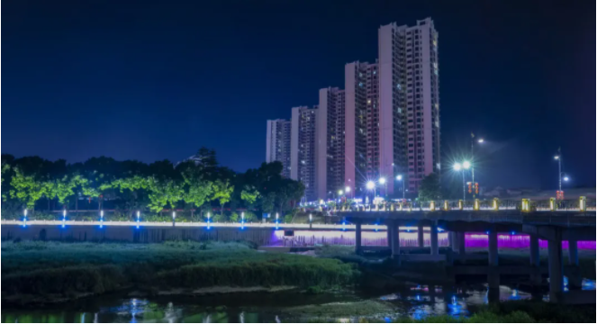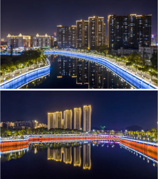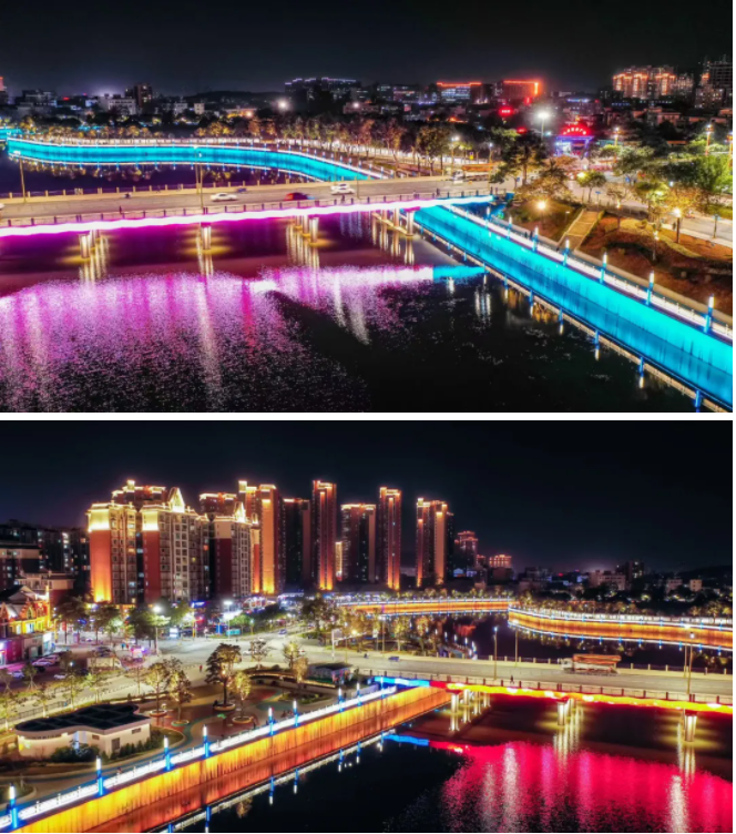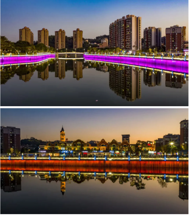東莞市鳳崗鎮核心主城區文創燈光項目范圍覆蓋“一河、兩岸、三橋”,分別為石馬河兩岸河堤、綠化帶、步道及臥龍橋、永盛北大橋、永和橋。