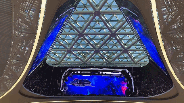 ▲深圳寶安國(guó)際機(jī)場(chǎng)衛(wèi)星廳。洲明科技以裸眼3D內(nèi)容為牽引,結(jié)合LED顯示大屏,首創(chuàng)沉浸式衛(wèi)星廳。