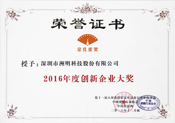 “金孔雀獎” 是數字標牌行業的大型評選活動,現已成為行業內最權威的獎項。此次2016年度數字標牌行業金孔雀獎評選活動歷時近三個月,經過網上投票、專家評審并經組委會核準后,小間距領軍品牌—洲明科技以領先的創新研發實力從眾多的參評企業中脫穎而出,榮獲“2016年度創新企業大獎”,其創新性智能小間距LED顯示屏UHQ系列以多個“智能化”首創設計引領行業發展新潮流,榮獲“2016年度優秀數字標牌創新產品大獎”。