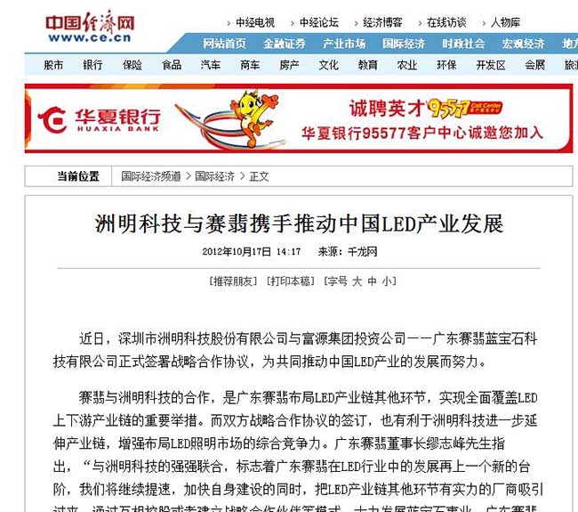 賽翡與洲明科技的合作,是廣東賽翡布局LED產業鏈其他環節,實現全面覆蓋LED上下游產業鏈的重要舉措。而雙方戰略合作協議的簽訂,也有利于洲明科技進一步延伸產業鏈,增強布局LED照明市場的綜合競爭力。廣東賽翡董事長繆志峰先生指出,“與洲明科技的強強聯合,標志著廣東賽翡在LED行業中的發展再上一個新的臺階,我們將繼續提速,加快自身建設的同時,把LED產業鏈其他環節有實力的廠商吸引過來,通過互相控股或者建立戰略合作伙伴等模式,大力發展藍寶石事業。廣東賽翡與洲明科技的合作在雙方共謀發展、取得共贏的同時也會利用好這個契機,竭力把梅州打造成藍寶石之鄉、LED之鄉。”