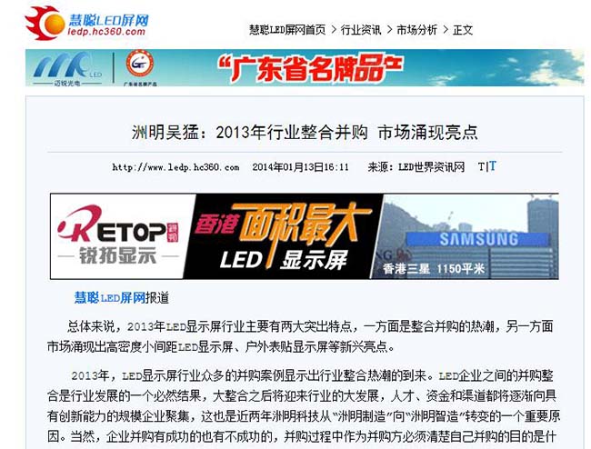 2013年,LED顯示屏行業(yè)眾多的并購案例顯示出行業(yè)整合熱潮的到來。LED企業(yè)之間的并購整合是行業(yè)發(fā)展的一個必然結(jié)果,大整合之后將迎來行業(yè)的大發(fā)展,人才、資金和渠道都將逐漸向具有創(chuàng)新能力的規(guī)模企業(yè)聚集,這也是近兩年洲明科技從“洲明制造”向“洲明智造”轉(zhuǎn)變的一個重要原因。當(dāng)然,企業(yè)并購有成功的也有不成功的,并購過程中作為并購方必須清楚自己并購的目的是什么,目前自身企業(yè)需要更多的是產(chǎn)品技術(shù)、銷售渠道還是產(chǎn)業(yè)鏈的把控能力,同時要綜合對比分析并購雙方企業(yè)的運(yùn)營方式及愿景等是否相吻合。