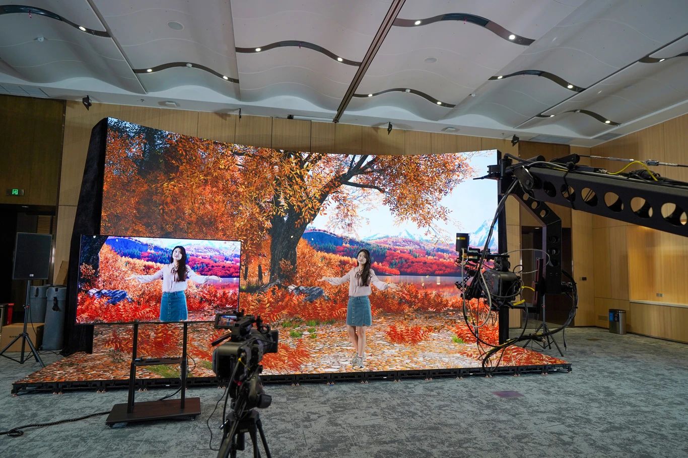 深圳國際會(huì)展中心全媒體演播中心XR虛擬拍攝平臺(tái),其核心是由洲明科技數(shù)千塊高分辨率LED模組拼接而成的弧形巨幕,分辨率可達(dá)8K級(jí)別,支持10000:1超高對(duì)比度與HDR技術(shù),配合7680Hz的超高刷新率,高速鏡頭也能呈現(xiàn)無拖影的清晰影像。獨(dú)創(chuàng)的自發(fā)光地屏系統(tǒng)采用納米級(jí)抗反光涂層,與主屏無縫銜接,構(gòu)建出完整的立體數(shù)字空間。